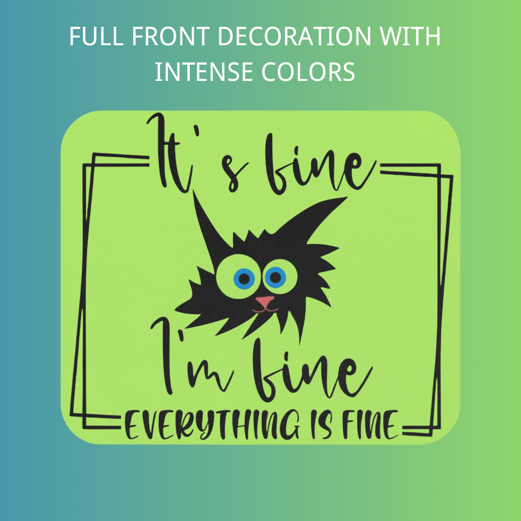 Brighten up your desk with the It’s Fine Cat Mouse Pad, featuring a hilariously frazzled black cat with wide blue eyes and a look that says it all — “It’s fine. I’m fine. Everything is fine.” Perfect for anyone who juggles deadlines, emails, and caffeine-fueled days, this mouse pad adds a splash of humor and personality to your workspace.